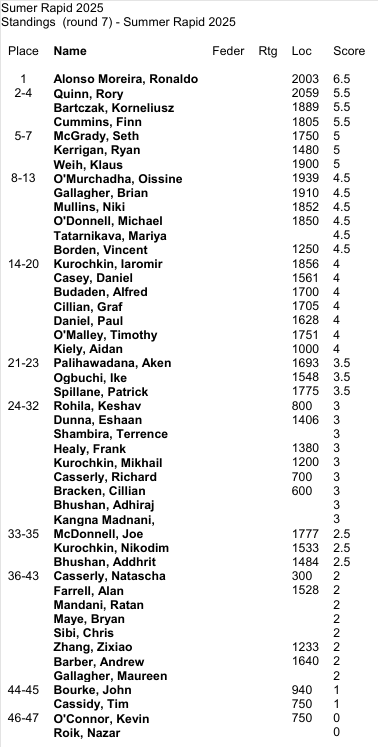 A huge congratulations to Galway Chess Club member Ronaldo Alonso Moreira on winning the event outright with a near-perfect score of 6.5 out of 7.